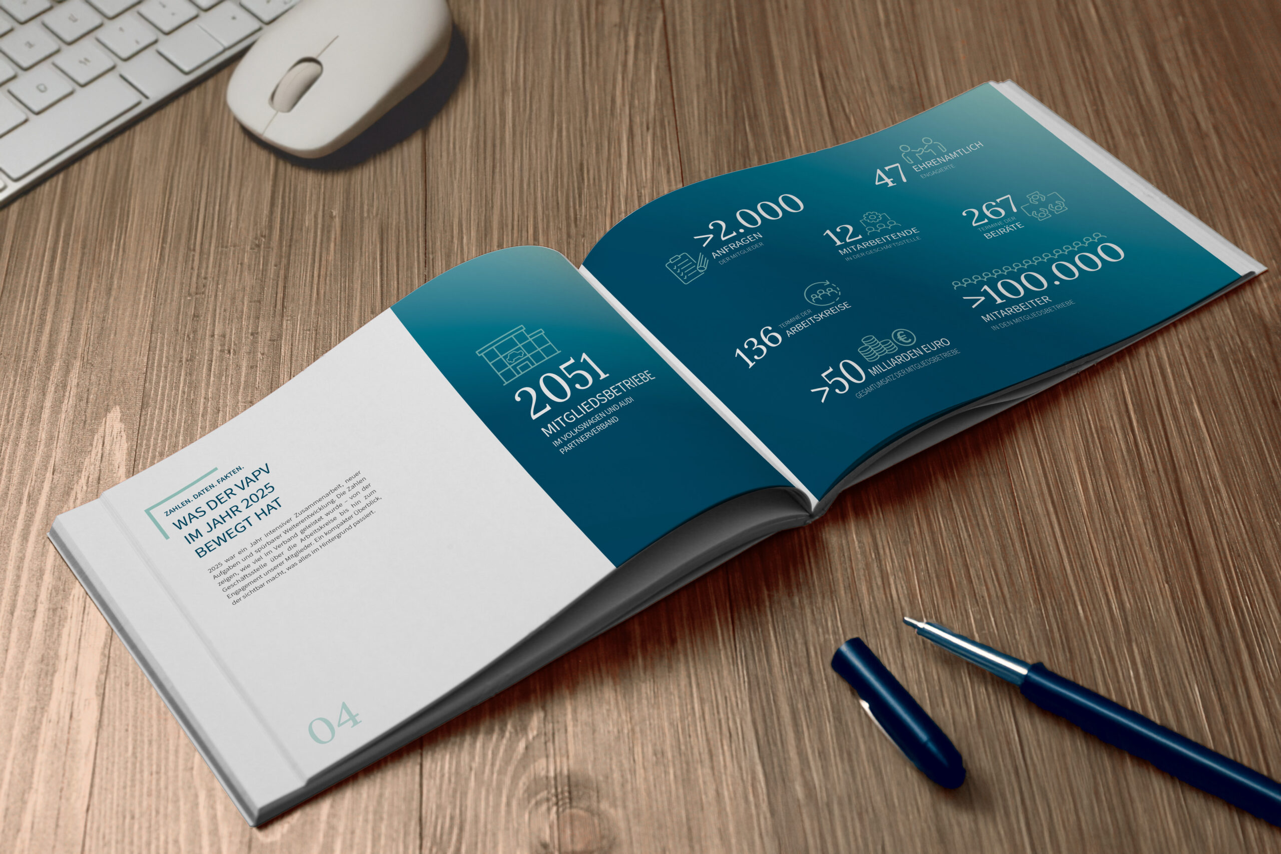 Wie bringt man ein ereignisreiches Jahr in ein Design, das genauso viel Drive hat wie der Verband selbst? Für den Volkswagen und Audi Partnerverband haben wir die Jahresrückblicksbroschüre neu gedacht – mit klarer Struktur, starken Bildern und einem Look, der Orientierung und Dynamik verbindet. Prägnante Typografie, markennahe Farben und eine durchdachte Gestaltung machen Erfolge, Entwicklungen und Meilensteine auf einen Blick erfassbar. So wird aus Information ein visuelles Erlebnis, das die Inhalte auf direktem Weg dorthin bringt, wo sie wirken: zu den Mitgliedern.